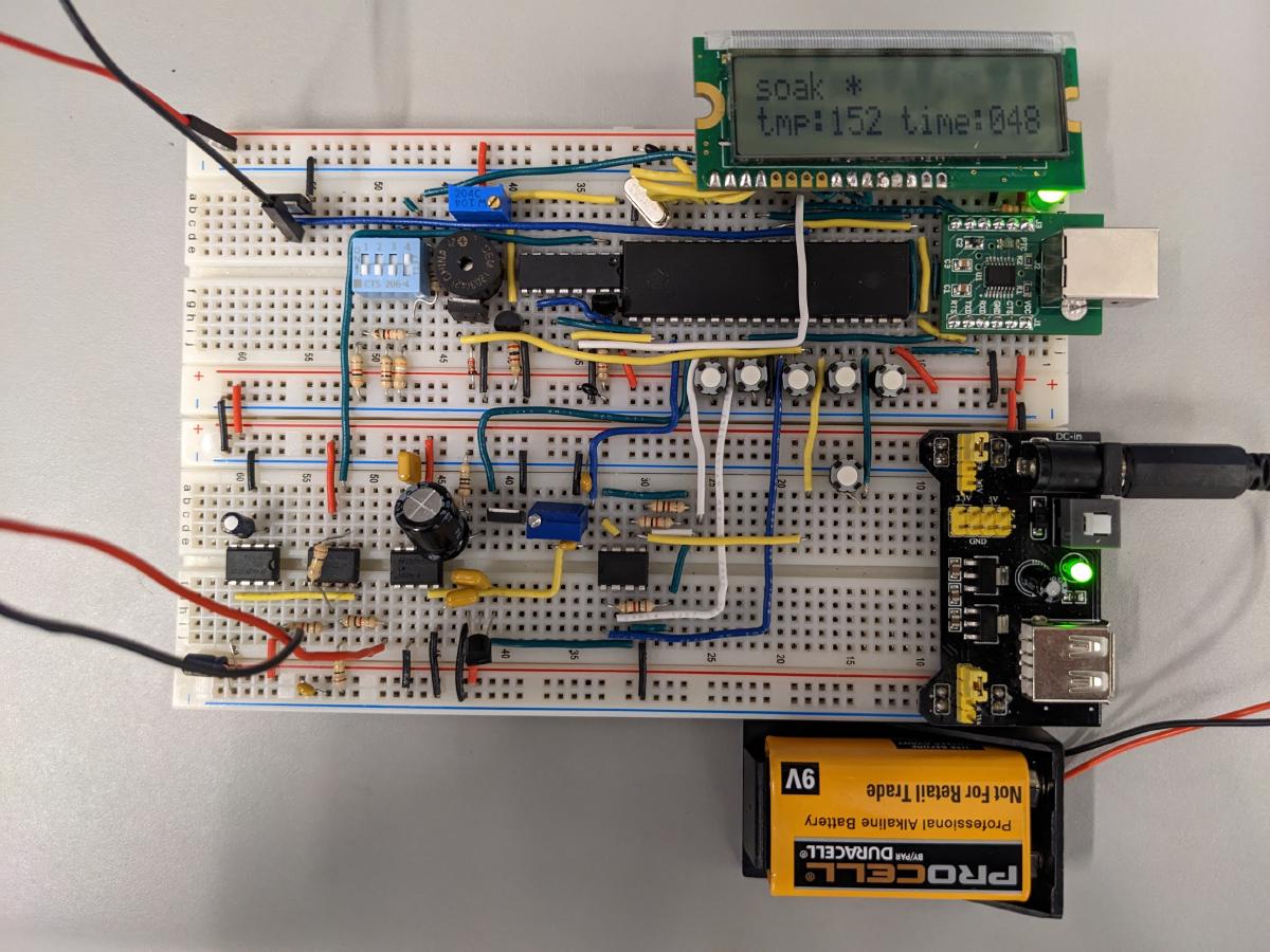 My teammates and I designed and built a reflow oven controller that controls the temperature of an oven via a pulse width modulation (PWM) signal to a solid-state relay (SSR) box. The reflow parameters such as reflow temperature, reflow time and cool down temperature can be adjusted. The parts we used can be found via this link to GitHub.