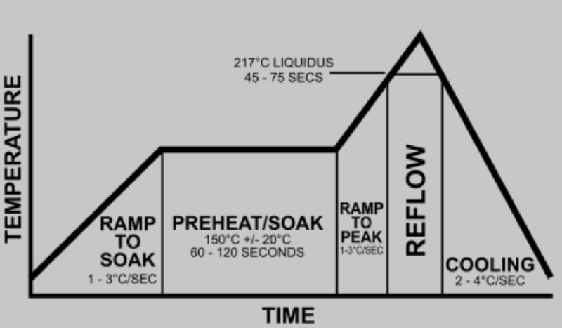 As seen below, the reflow process consists of 5 phases per cycle. Each cycle last a different amount of time and required to be in a different temperature range. To control the temperature of the oven, we can to adjust the amount of power used by it. Since the toaster oven available to us can only operate at full power when it is on, we need to use some “trick”.